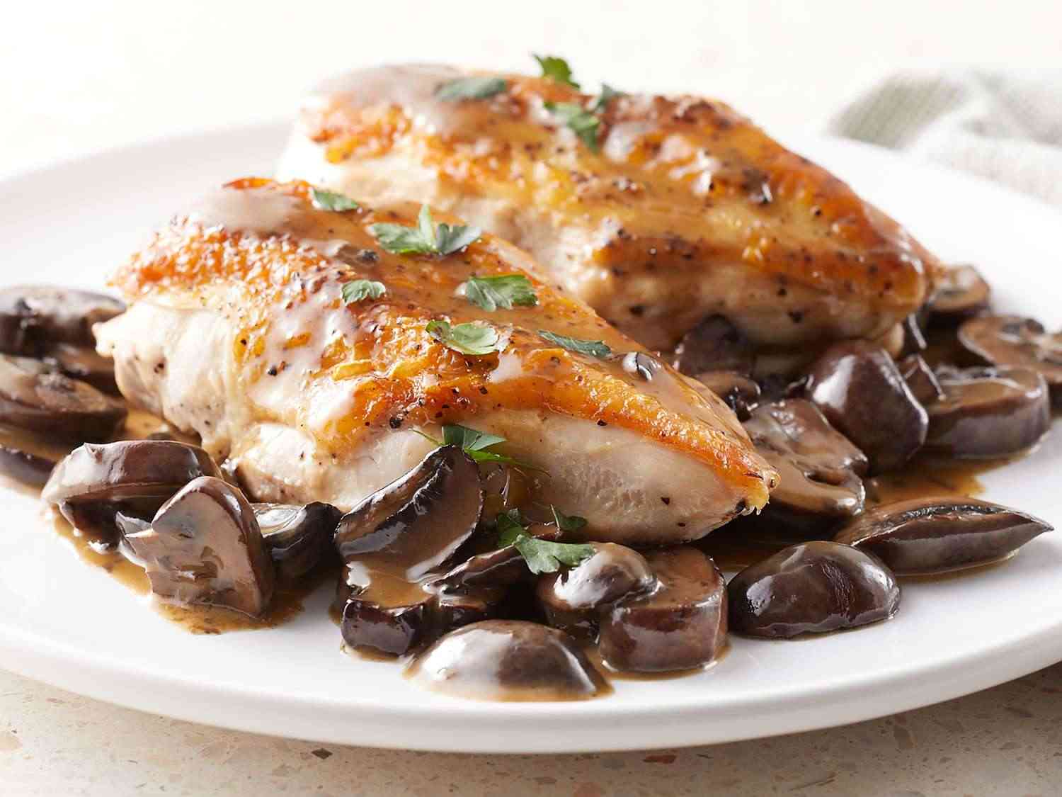 - Step 9:Season with salt and pepper. Spoon mushroom sauce over chicken and serve. Dotdash Meredith Food Studios