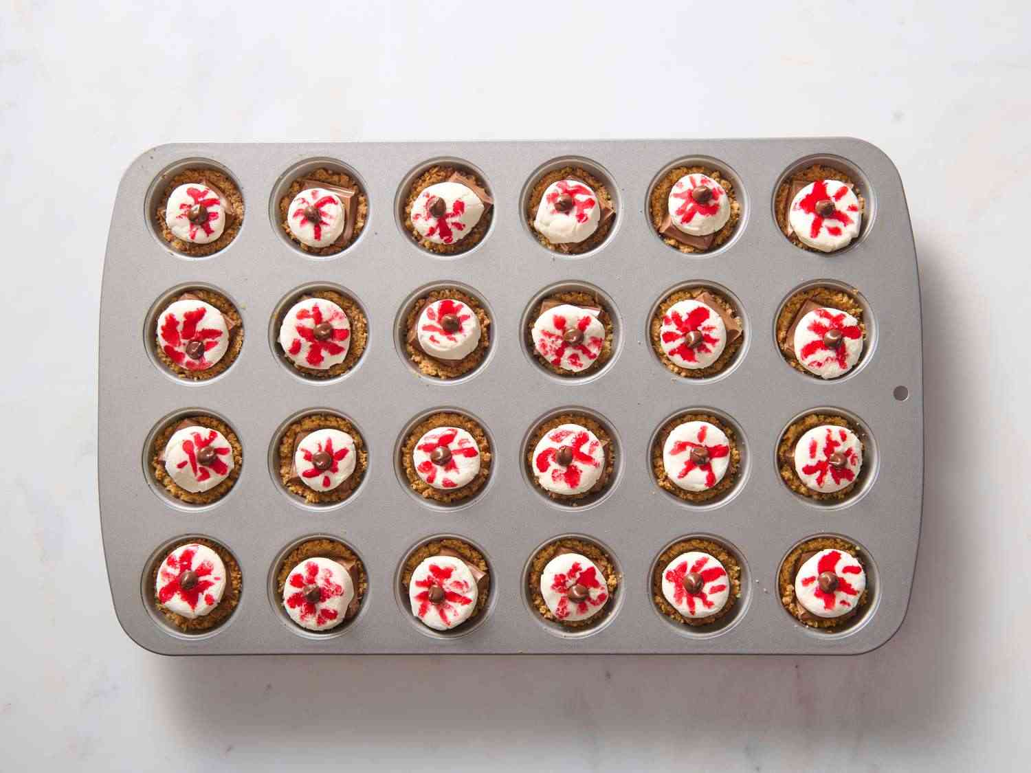 - Step 5:Paint red circles and lines to resemble blood-shot eyes on top of each marshmallow using red food coloring. Allrecipes/Julia Hartbeck